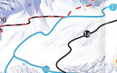 In der Kurve führt die Skiroute 12 auf die blaue Abfahrt 2. An dieser Stelle zweigt auch die Variante Madrisa Steilhang ab (nicht in der Tour enthalten). Blaue Abfahrt 2 (Birkenegg)