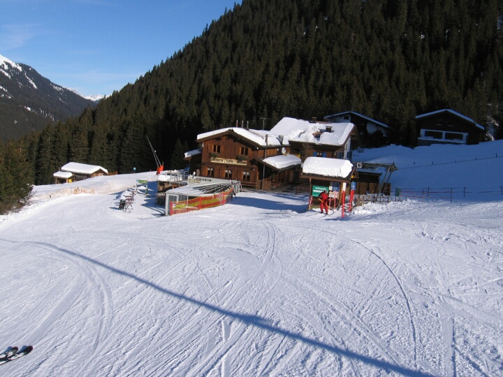 Rechts ist die Talstation des 1-SL Vergalden Übungslift (F). Dahinter ist die Pizzaria Barga. Blaue Abfahrt 2 (Birkenegg)
