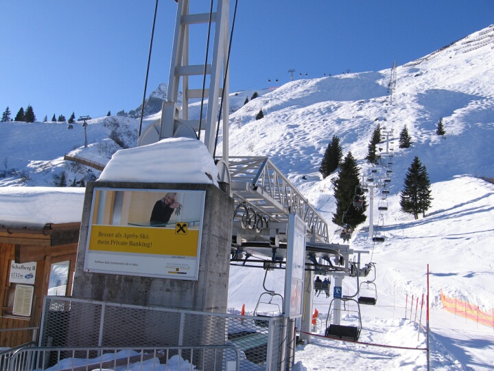 Talstation und weiterer Verlauf der Bahn mit Skiroute 3. Links sieht man die 8-EUB Schafberg (A). Talstation DSB Schafberg II (B)