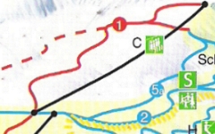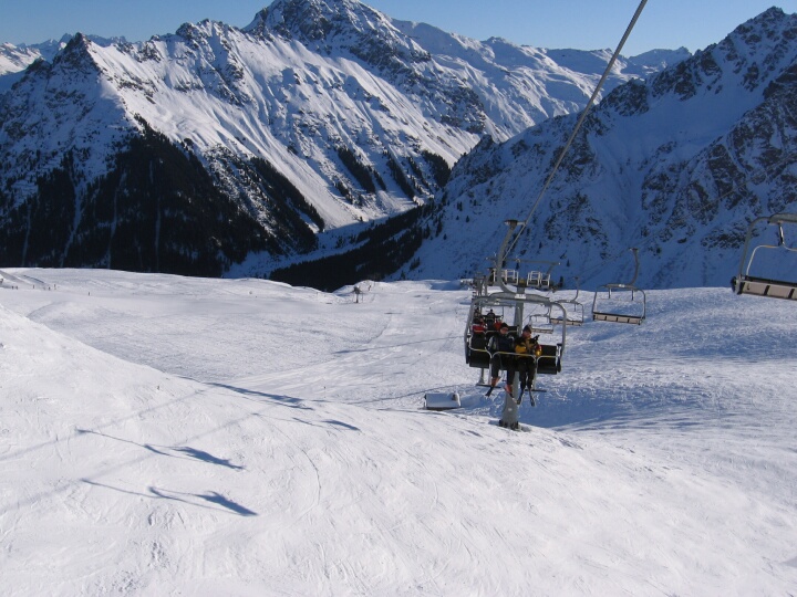 Blick zurück: Links hinten neben der Bahn ist die blaue Abfahrt 5a (Steehüsli). Weiter hinten sieht man die Bergstation des 2-SL Valzifenz (G) 4-SB Gargellner Köpfe