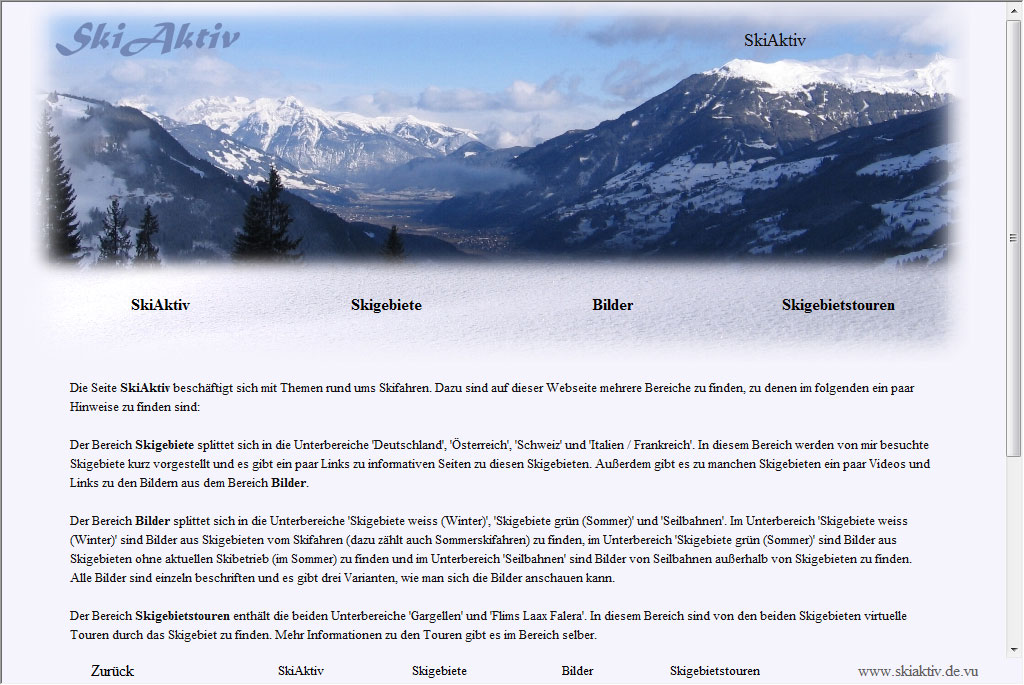 Es gab bereits einige Seiten, die ich Smartphone optimiert habe. Dazu gehörten die Auswahlseiten der Obermenüpunkte "SkiAktiv", "Skigebiete", "Bilder" und "Skigebietstouren" sowie die Startseite, die Unterseiten des Menüpunkts "Bilder" ("Skigebiete weiß (Winter)", "Skigebiete grün (Sommer)", "Seilbahnen") und die Bilderseiten selber.