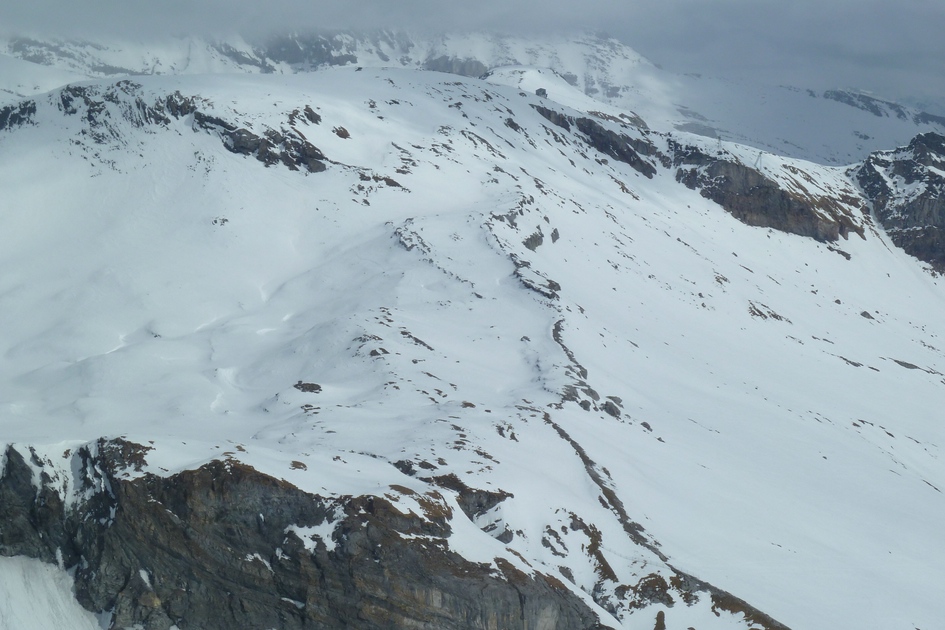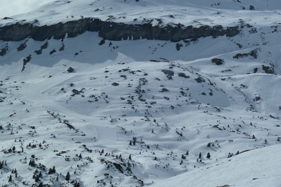 Blick von der Skiroute 70 zur Cassonsbahn - vor der Felswand, kaum auszumachen, befindet sich eine Kabine der Cassonsbahn.