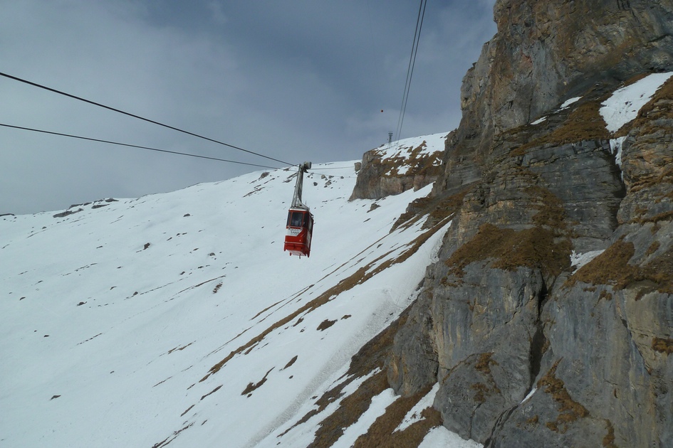 Kabine der Cassonsbahn vor der Felswand gezoomt