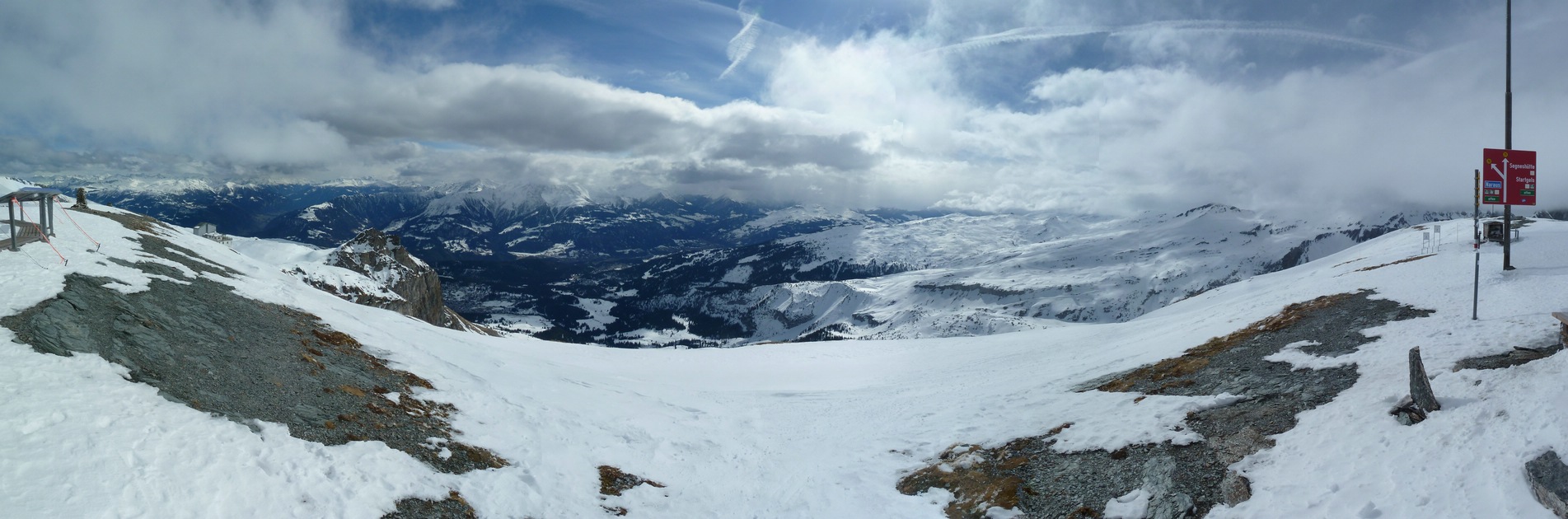 Panoramabild vom Cassonsgrat. Links die Bergstation der Cassonsbahn, rechts der Start der Skirouten.