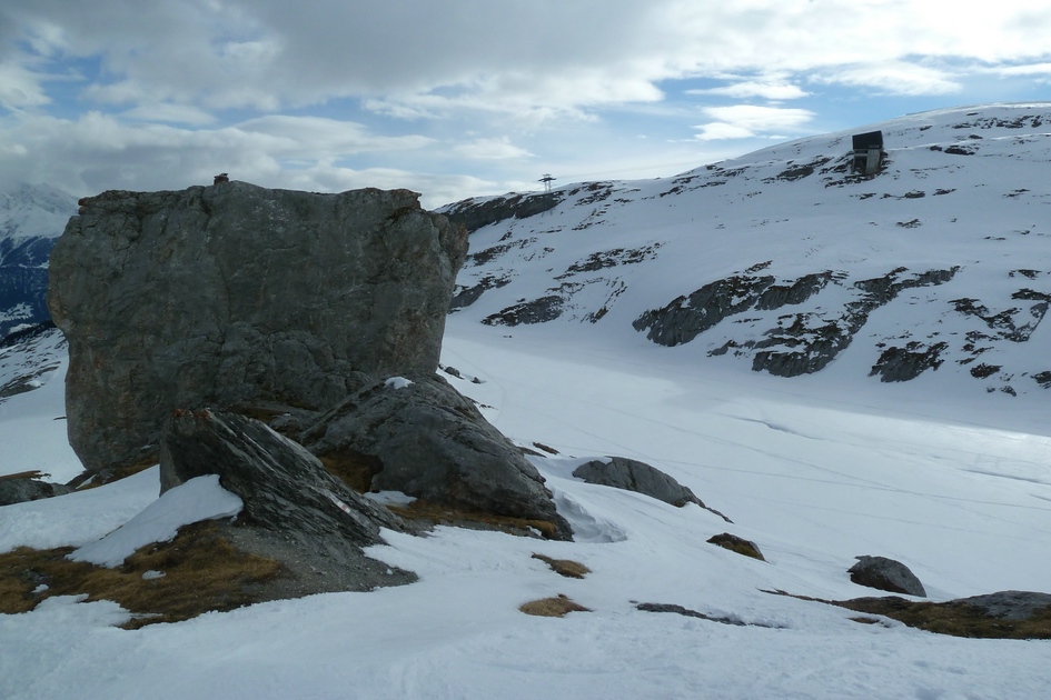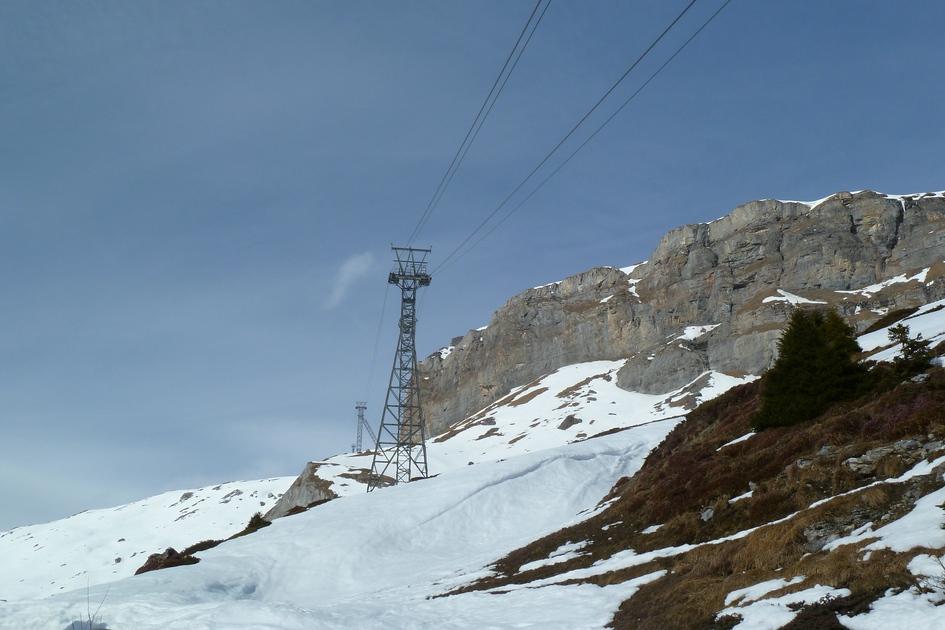 Blick von der Skiroute 70 zur Cassonsbahn - Wieder versteckt sich eine Kabine vor der Felswand