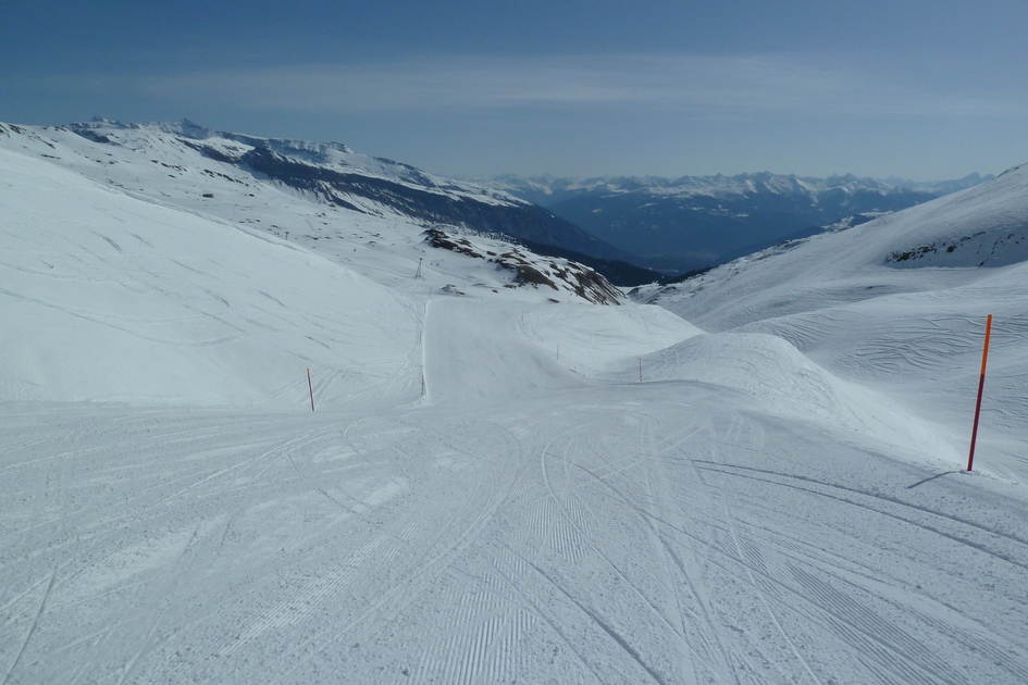 Aussicht von der Bergstation Fuorcla da Sagogn. Links der Start der schwarzen Abfahrt 37, rechts der Start der Abfahrt 36 und 38.