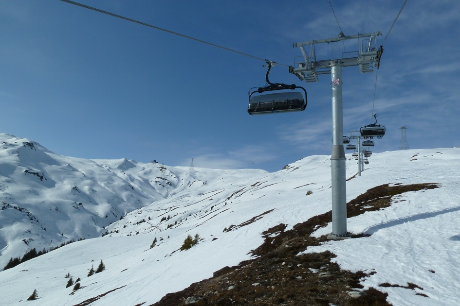 Blick aus der Sesselbahn Plaun zu den blauen Abfahrt 38 und 34. Rechts oben die schwarze Abfahrt 26 (Siala West). Weiter links die Station Vorab.