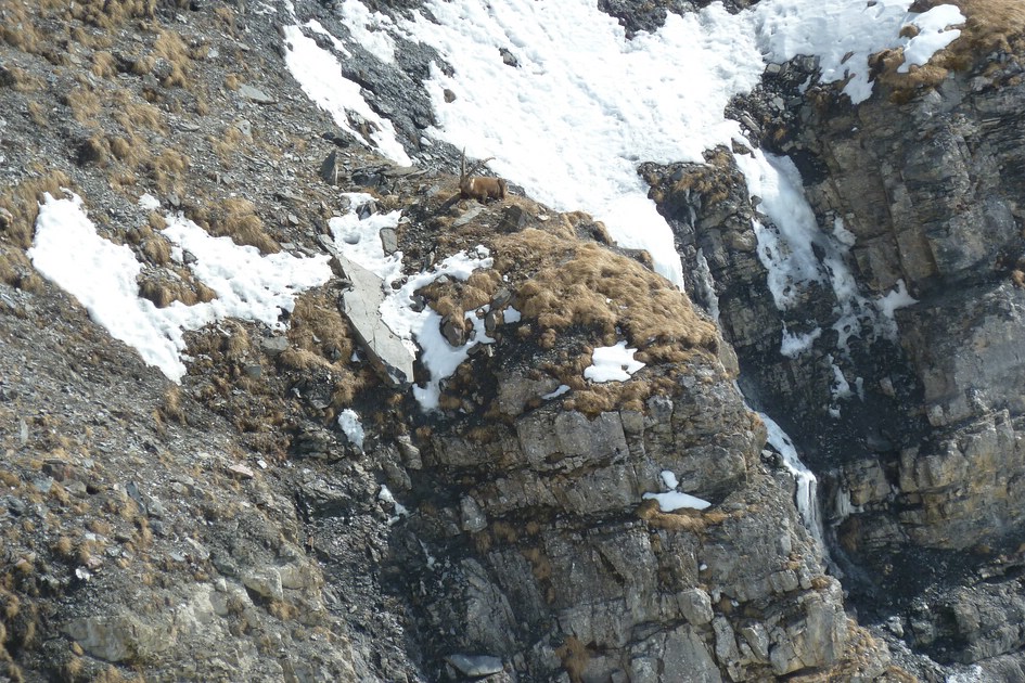 Blick aus der Cassonsbahn. Bei den Felsen liegt (schwach zu erkennen ) ein Steinbock.