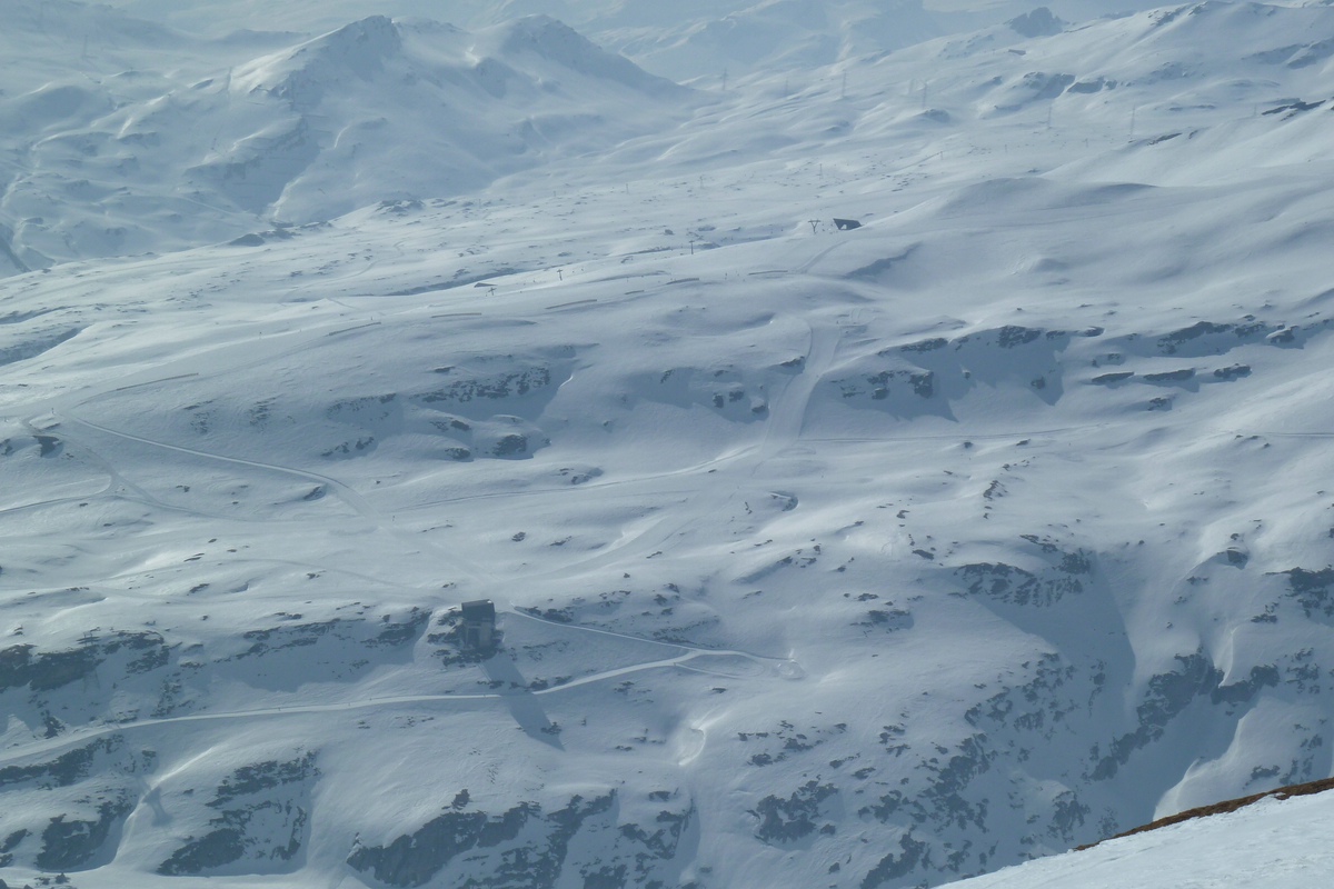 Zoom La Siala mit Bergstation der 3-KSB La Siala und der roten Abfahrt 10 (Siala Ost). Weiter im Hintegrund sieht man auch den Vorab Gletscher mit der roten Abfahrt 32 und 33.