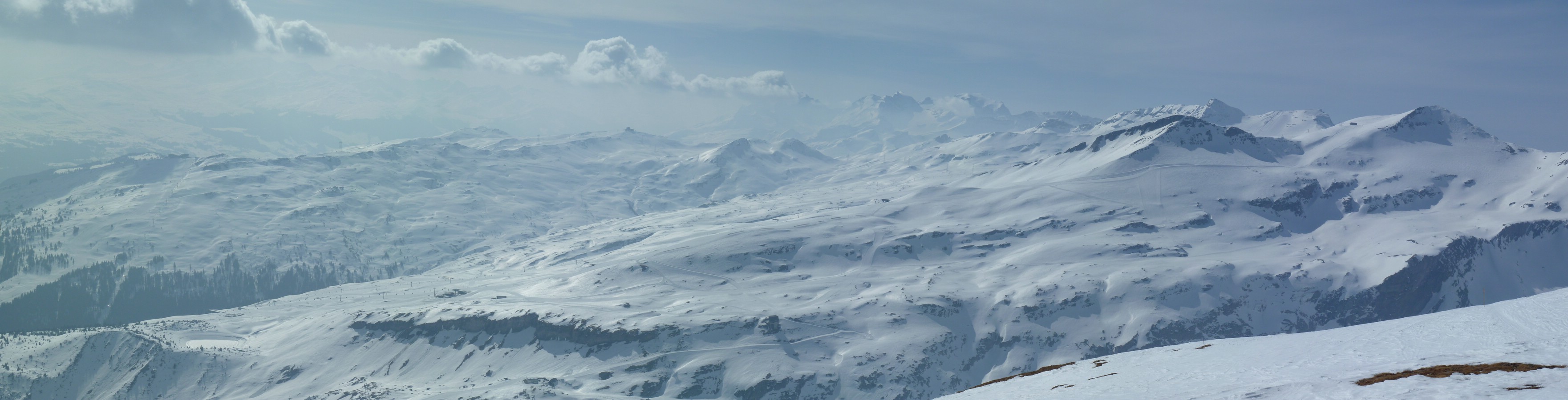 Aussicht vom Cassonsgrat vom Crap Sogn Gion (links) bis zum Vorab Gletscher und La Siala (Laaxer Stöckli) (rechts)