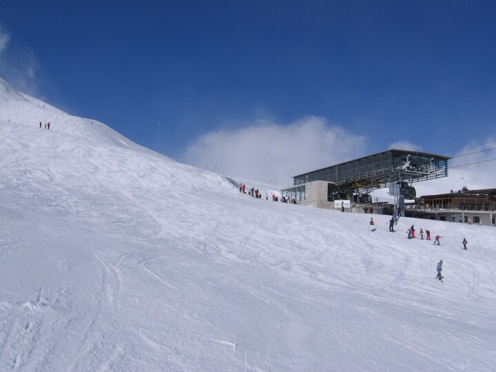 Blaue Abfahrt 12 (Mutta), Blick zurück zur Bergstation der 8-EUB Arena Express
