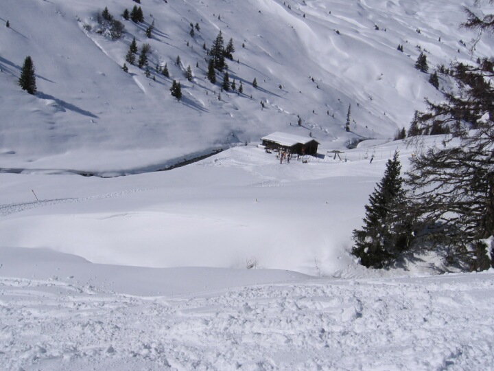 Rote Abfahrt 44 (Masegn West) Linke Variante, Blick zur Talstation DSB Alp Ruschein