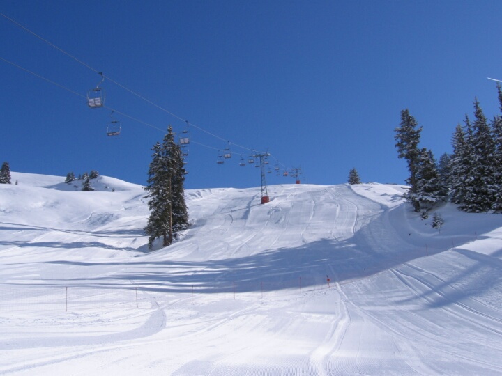Rote Abfahrt 44 (Masegn West) Rechte Variante, An der Talstation DSB Alp Ruschein, Blick zurück zum Steilhang