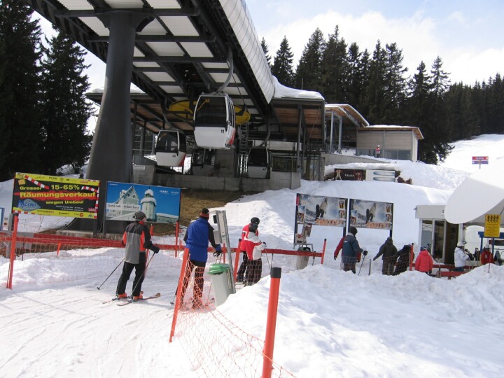 Curnius: Anstehbereich zur 4-KSB Curnius, Blick zur Bergstation 12-EUB Larnags, dahinter die Bergstation der 4-KSB Falera