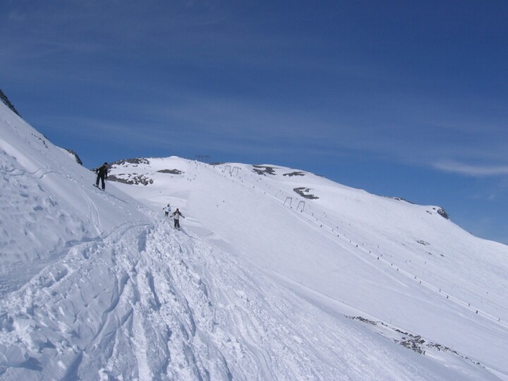 Blauer Weg zum Sattel, Blick zurück zur Bergstation Vorab Gletscher