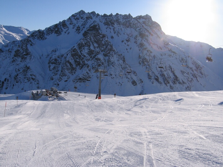 Blick zur Talstation der 4-SB Gargellner Köpfe (C). Blauen Abfahrt 2 (Birkenegg)