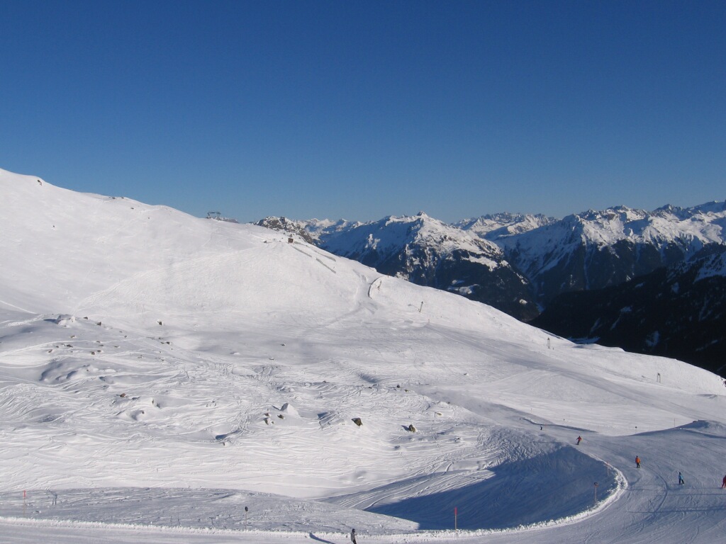 Blick Richtung (Bergstation) 2-SL Schafberg mit blauer Abfahrt 9. Unten rechts verläuft die blaue Abfahrt 5 (Gargellener Köpfe).