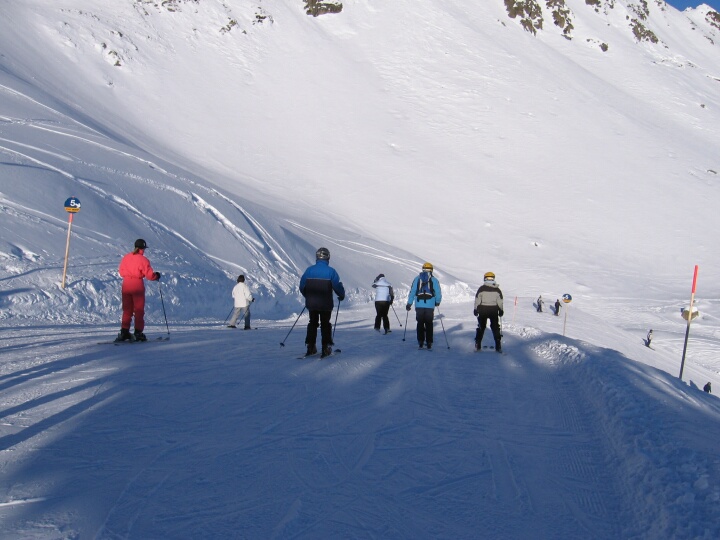 Start der blauen Abfahrt 5. Im Pistenplan ist dieser Abschnitt seltsamerweise nicht eingezeichnet. Dafür ein nicht existierendes Stück der roten Abfahrt 1. Bergstation 4-SB Gargellner Köpfe Blaue Abfahrt 5 (Gargellener Köpfe)
