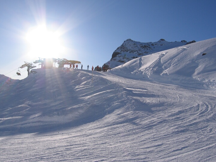 Blick zurück zur Bergstation der 4-SB Gargellner Köpfe. (Im Pistenplan ist dieser Abschnitt der blauen Abfahrt 5 seltsamerweise nicht eingezeichnet.) Blaue Abfahrt 5 (Gargellener Köpfe)