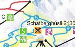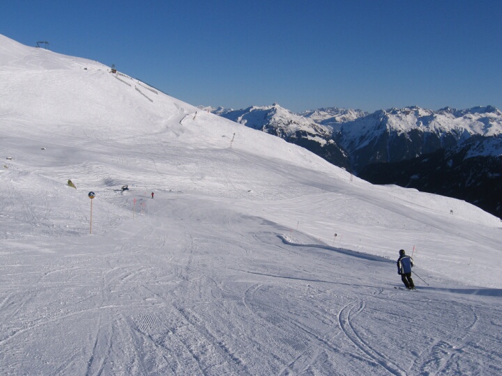 Abzweig der blauen Abfahrt 5a. Weiter vorne sieht man auch schon den Abzweig zur blauen Abfahrt 9. Dahinter blickt man auf den 2-SL Schafberg (D). Blaue Abfahrt 5 (Gargellener Köpfe)