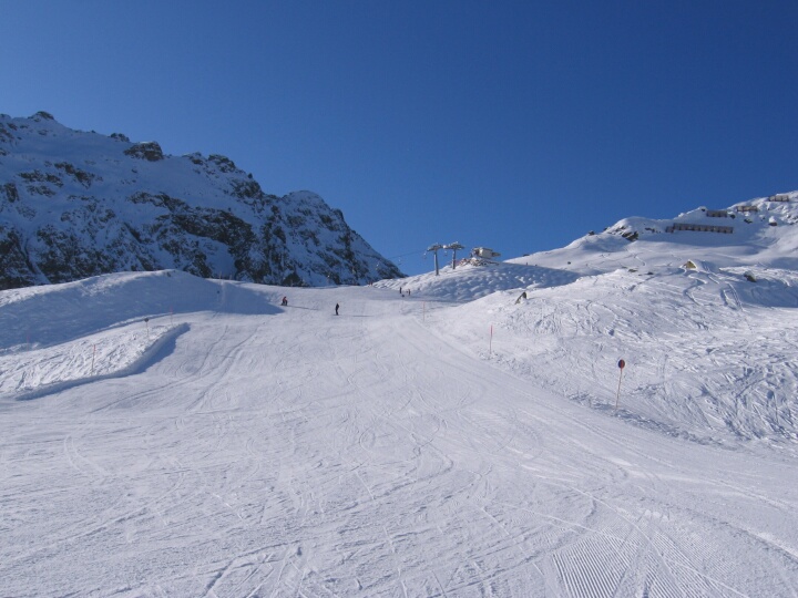 Beim Abzweig zur blauen Abfahrt 9. Blick zurück Richtung Bergstation 4-SB Gargellner Köpfe (C). Blaue Abfahrt 5 (Gargellener Köpfe)