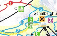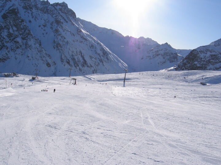 Die blaue Abfahrt 5 führt nun auf die blaue Abfahrt 2. Man blickt auf die Lifte 2-SL Valzifenz (G) und dahinter die 4-SB Gargellner Köpfe (C). Blaue Abfahrt 5 (Gargellener Köpfe)