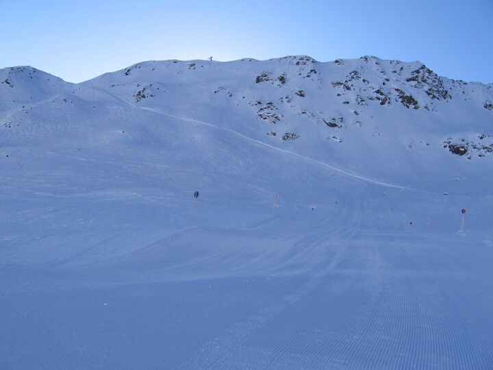 Blick zurück. Oben erkennt man die Umlenkstation des 2-SL Schafberg (D). Blaue Abfahrt 6 (Täli)