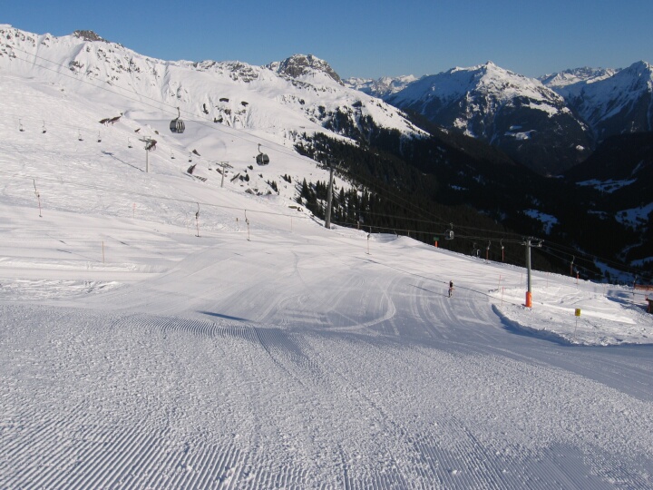 Kreuzung mit dem 2-SL Schlüachteck (H). Dahinter sieht man die Lifte 8-EUB Schafberg (A) und DSB Schafberg II (B). Blauen Abfahrt rechts vom 2-SL Schlüachteck (H)