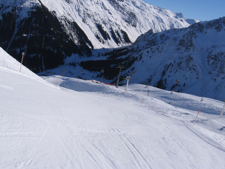 Blick zu den Liften DSB Schafberg II (B) und 8-EUB Schafberg (A). Blaue Abfahrt 9a