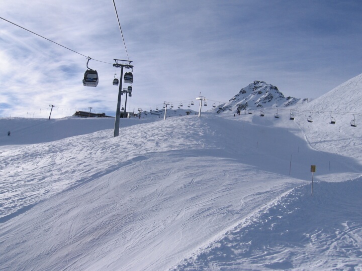 Über der blauen Piste 9a (nicht im Pistenplan eingezeichnet!). Links der 2-SL Schlüachteck (H) und rechts die DSB Schafberg II (B). 8-EUB Schafberg (A)