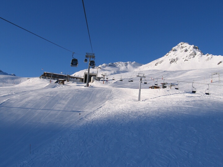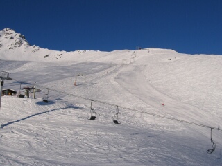 Blick auf die blaue Abfahrt 9 (Schlüachteck) mit dem 2-SL Schlüachteck (H) links daneben. Rechts die DSB Schafberg II (B) und dahinter die Talstation des 2-SL Schafberg (D). 8-EUB Schafberg (A)