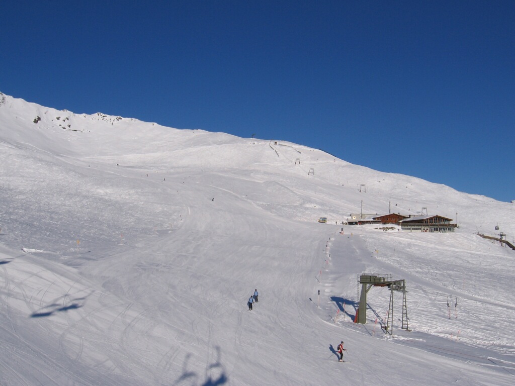 Blick auf die blaue Abfahrt 2/5 und Richtung Bergstation 2-SL Schafberg (D). Rechts vorne die Bergstation des 2-SL Valzifenz (G) und weiter hinten die der 8-EUB Schafberg (A).