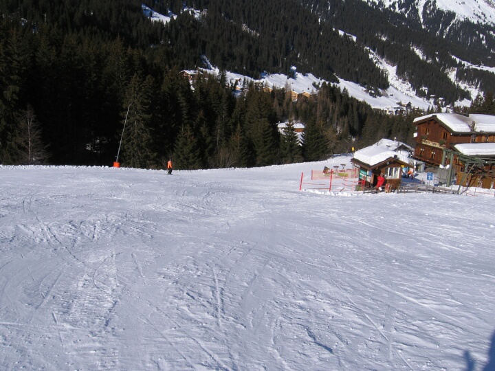Die blaue Abfahrt am Vergalden Übungslift trifft auf die blaue Abfahrt 2 (Birkenegg). Rechts die Talstation des 1-SL Vergalden Übungslift (F). Blaue Abfahrt am 1-SL Vergalden Übungslift (F)