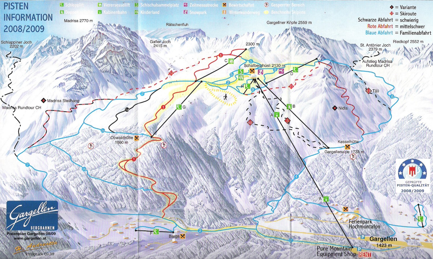 Die Skigebietstour Gargellen ist eine virtuelle Tour durch das Skigebiet Gargellen im Montafon. Sie besteht aus 233 Bildern die alle vom 12. und 16. Januar 2009 stammen. Nicht in der Tour enthalten ist die Skiroute 11, da diese an beiden Tagen geschlossen war, sowie der Tellerlift Madrisa Übungslift (E). Von diesem kommt man nicht direkt wieder ins Restskigebiet, so dass ich den Lift samt Pisten ausgelassen habe. Die beiden Varianten Madrisa Steilhang und Nidla bin ich ebenfalls nicht gefahren, sodass es von denen auch keine Bilder gibt.