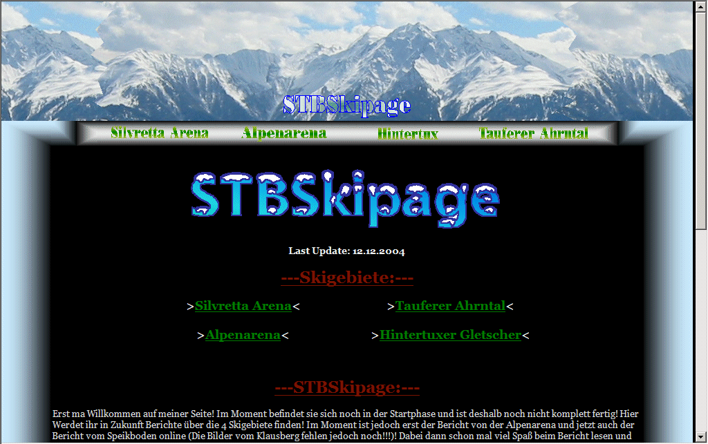Zwei Neuerungen, die unter diesem Datum angegeben sind, sind ebenfalls schon seit längerer Zeit auf dieser Seite zu finden. Das sind die Skigebiete 'Spitzingsee' und 'Kaunertaler Gletscher' im Bereich Skigebiete. Diese sind Vorbereitungen zu den Bildern, die hoffentlich bald auf dieser Seite zu finden sind.
