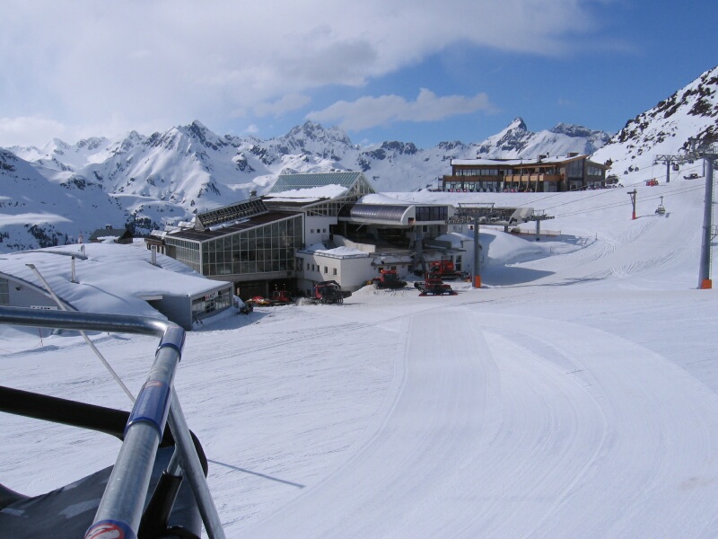 Blick zur Talstation 8-KSB/B Idjochbahn mit Pistenraupen