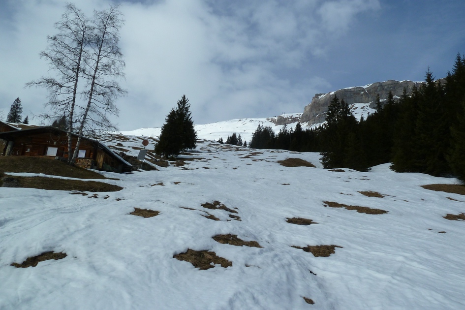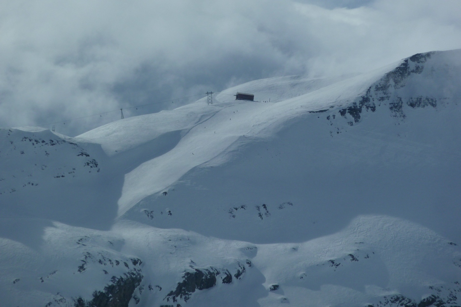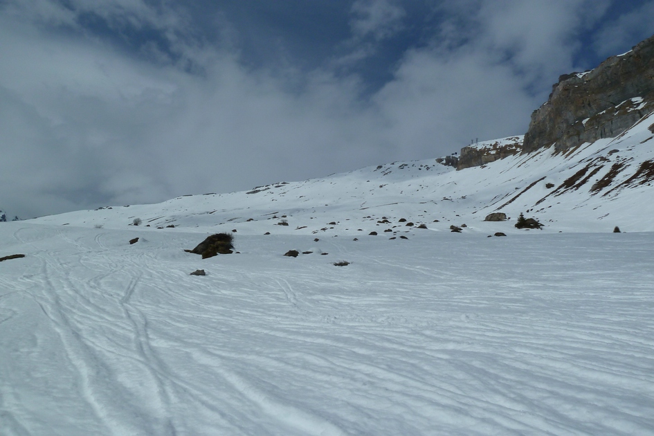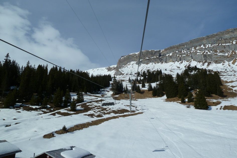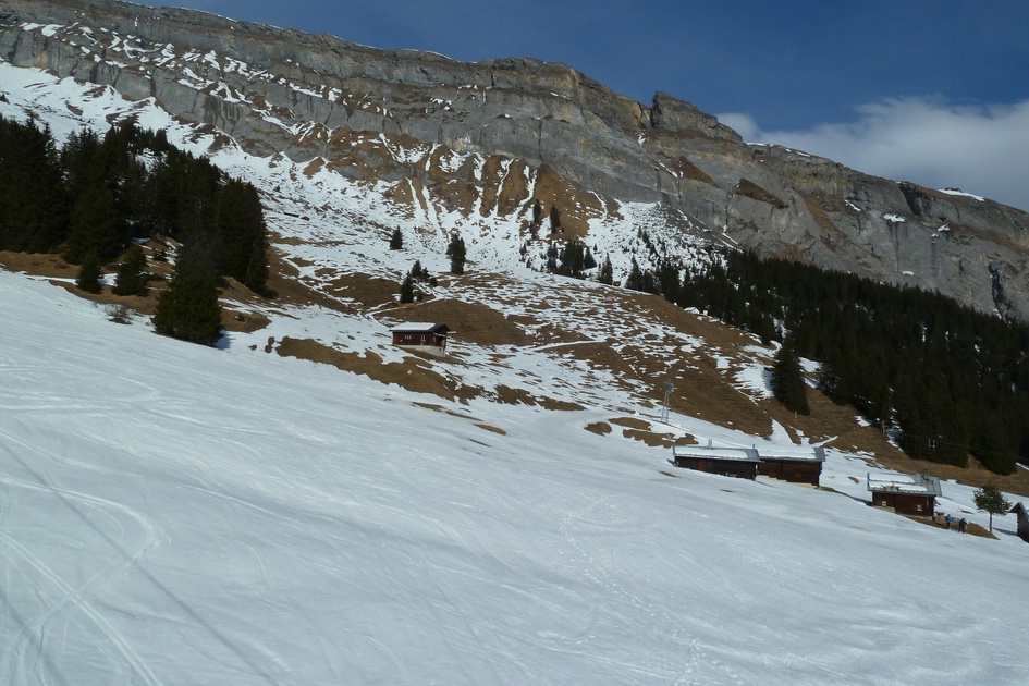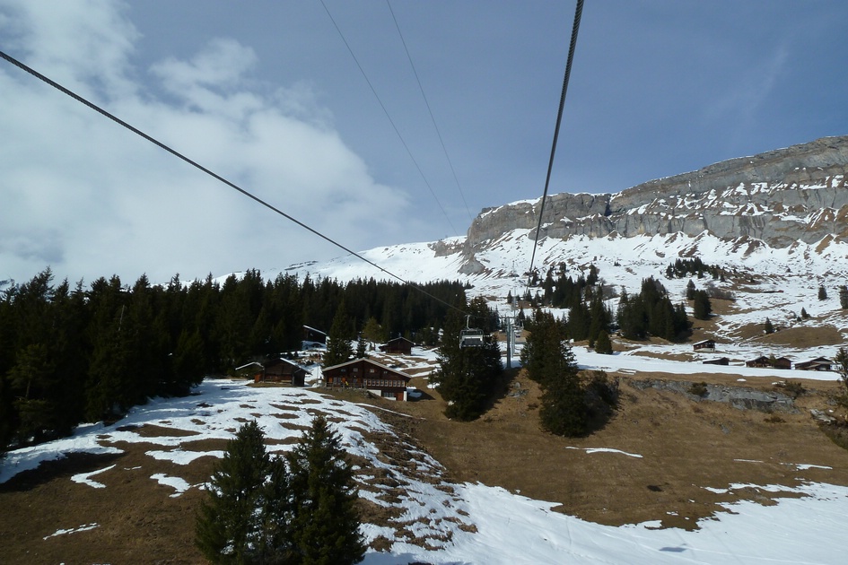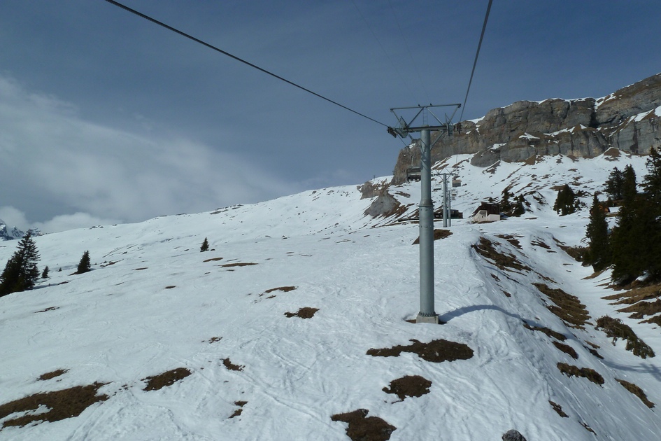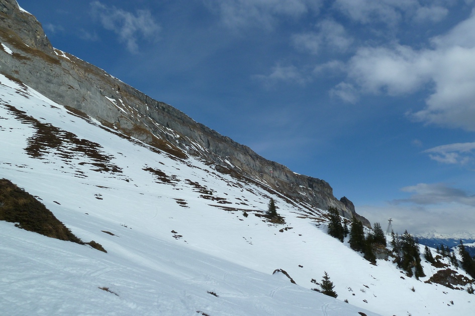 Blick von der Skiroute 70 zur Cassonsbahn - Wieder versteckt sich eine Kabine vor der Felswand