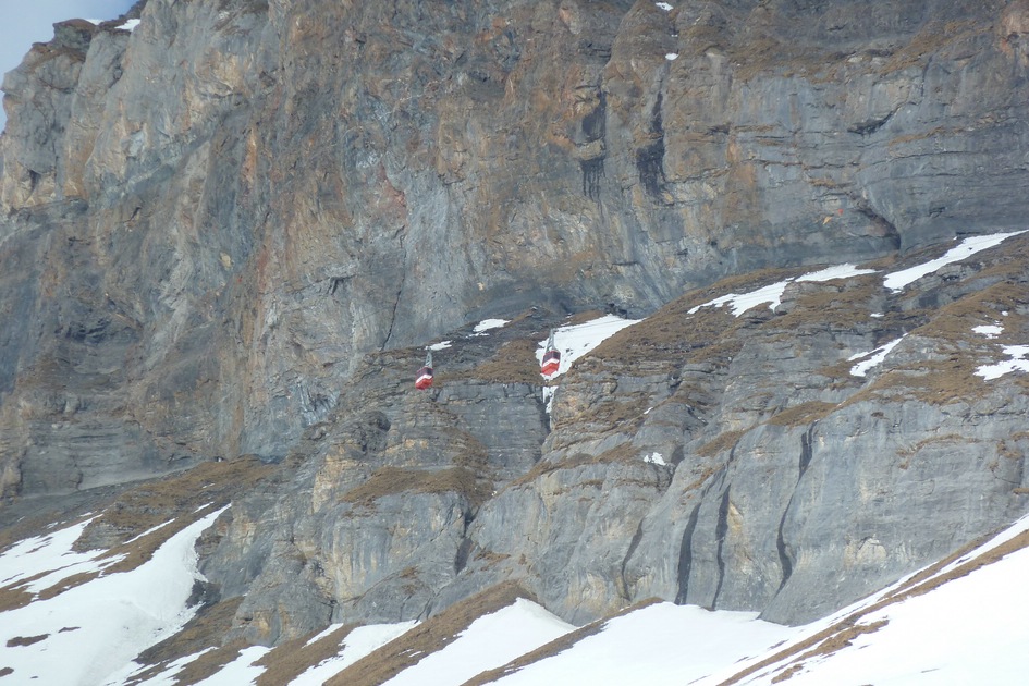 Beide Kabinen der Cassonsbahn vor der Felswand