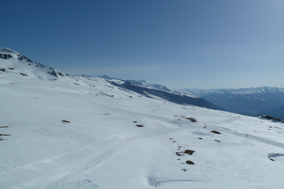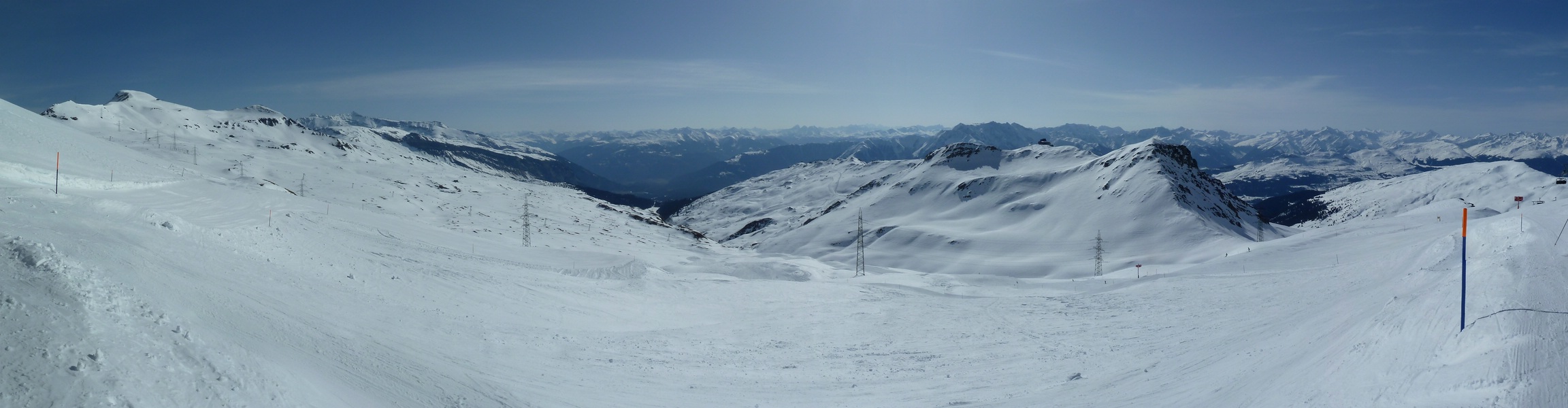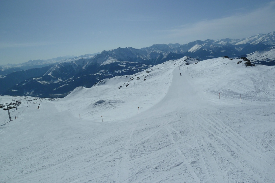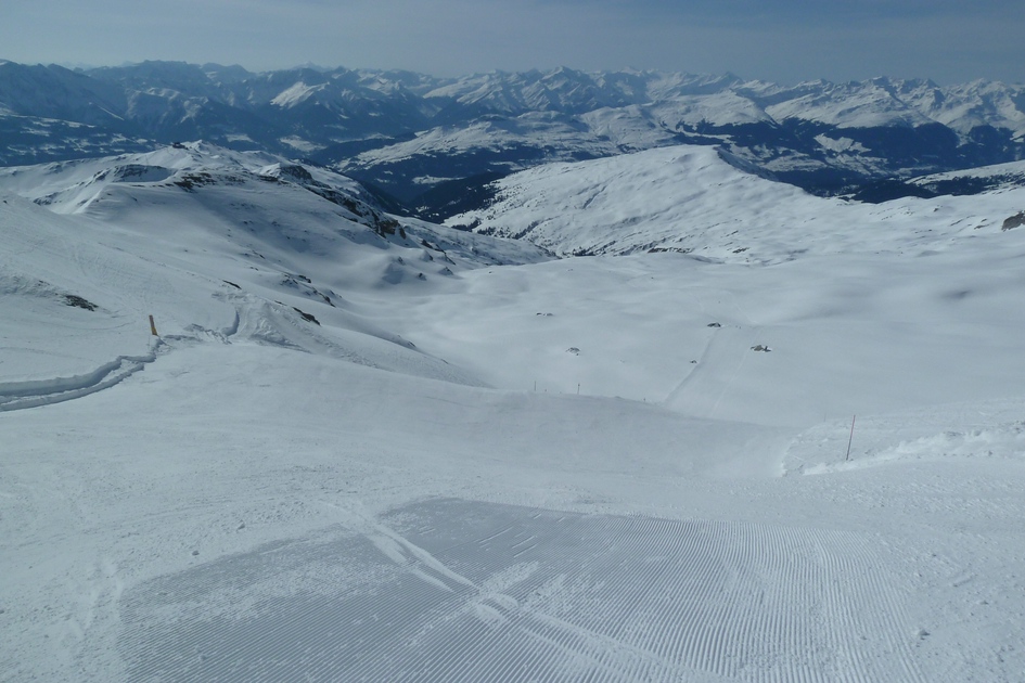 Aussicht von der Bergstation Fuorcla da Sagogn. Links der Start der schwarzen Abfahrt 37, rechts der Start der Abfahrt 36 und 38.