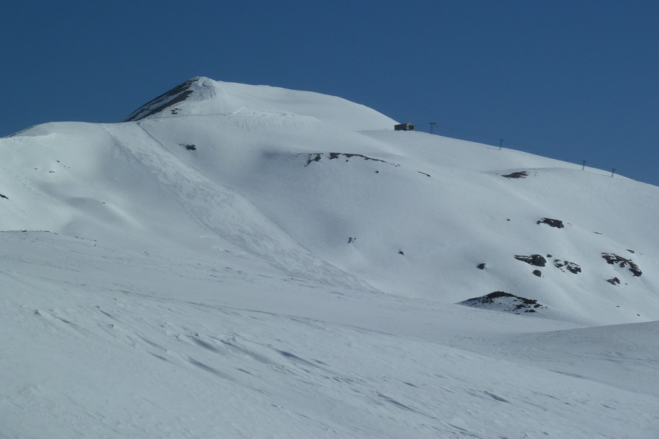 Zoom zum Steilhang der schwarzen Abfahrt 26 (Siala West) und der Bergstation der Sesselbahn La Siala.