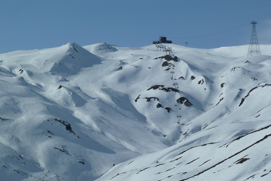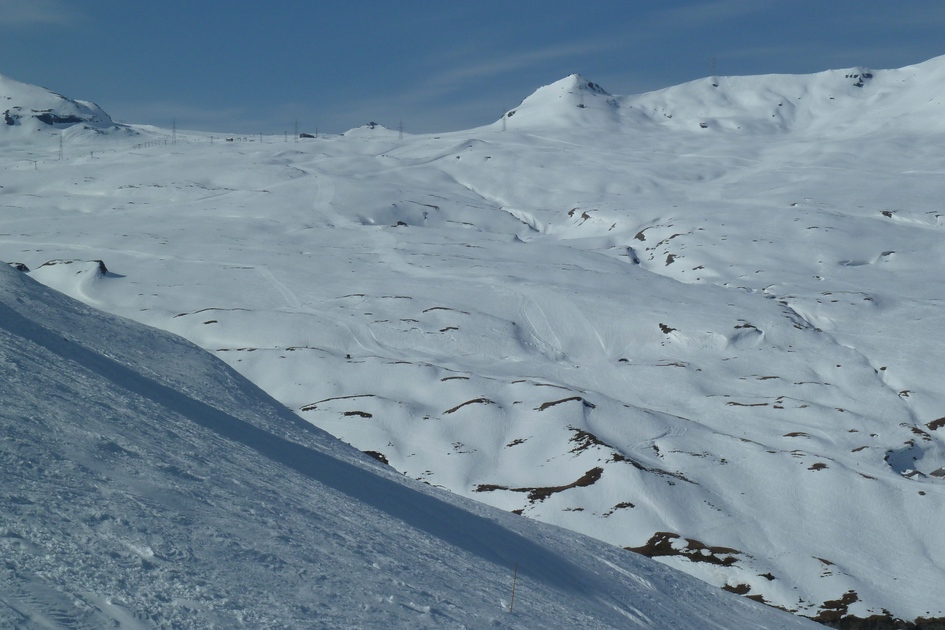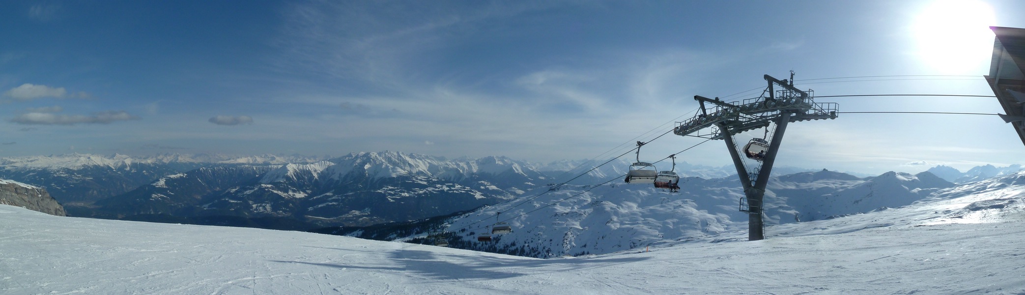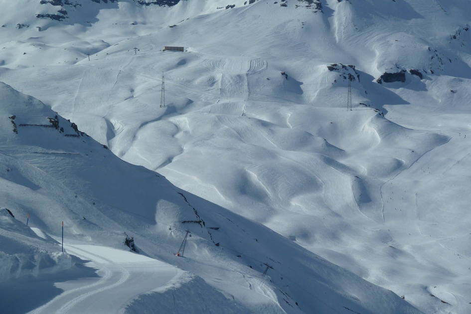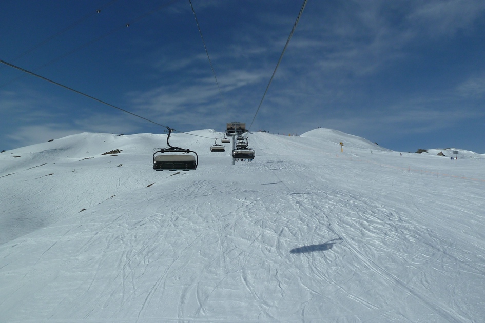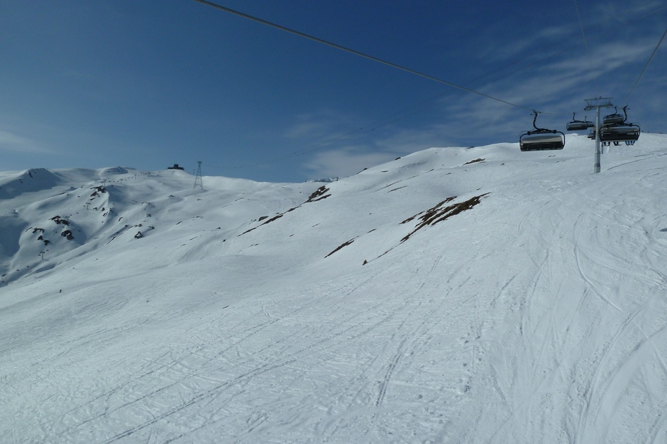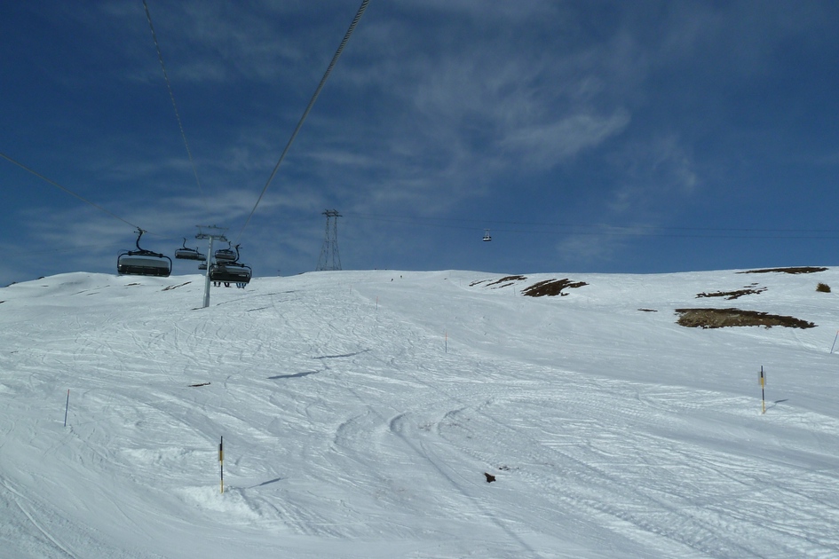 Blick aus der Sesselbahn Plaun zu den blauen Abfahrt 38 und 34. Rechts oben die schwarze Abfahrt 26 (Siala West). Weiter links die Station Vorab.