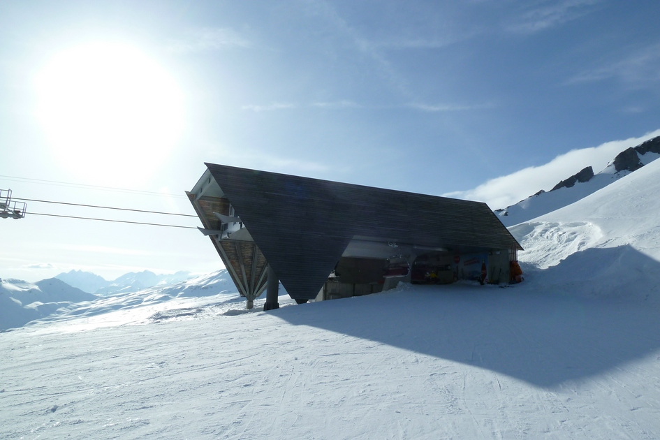 Skiroute 79 - Weiter unten ist eine Schneilanze der blauen Abfahrt 38 zu sehen. In diesem Bereich befindet sich seit der Saison 15/16 die Talstation der 10-Gondelbahn La Siala.