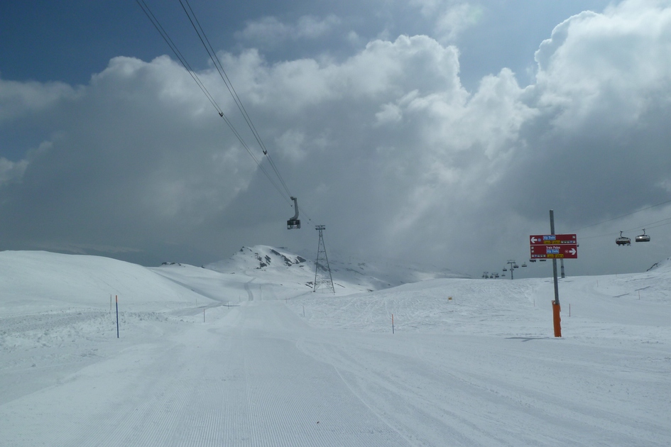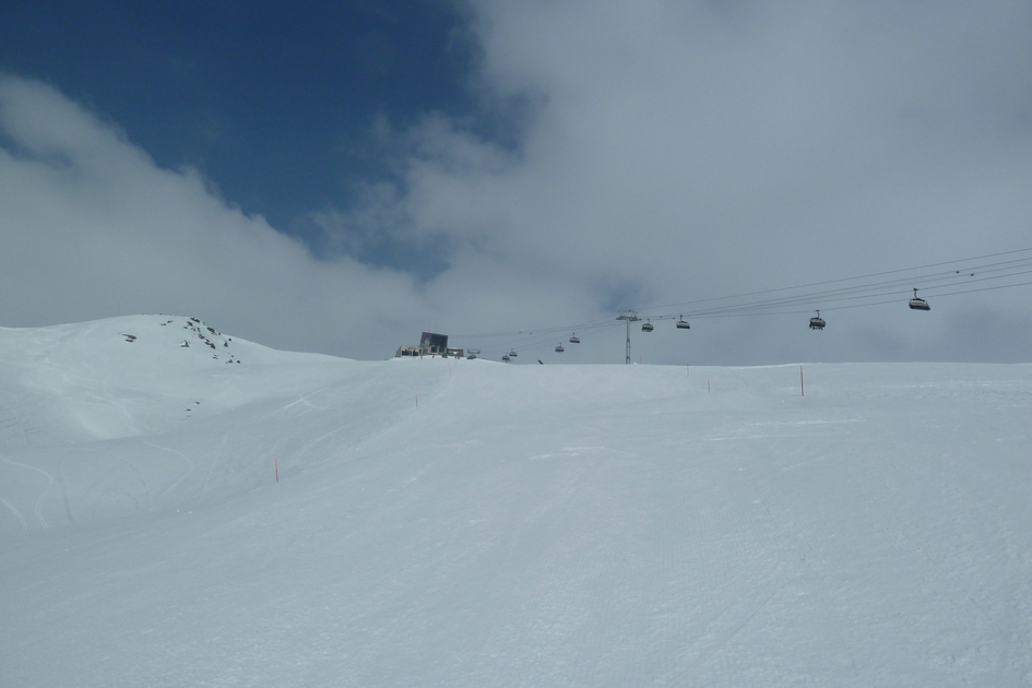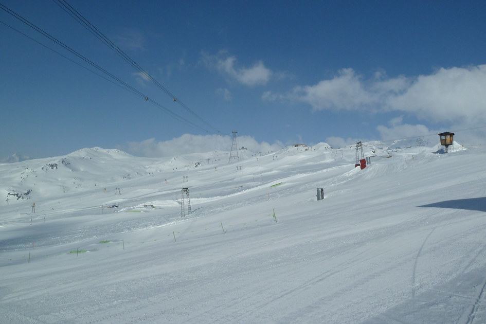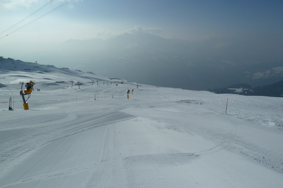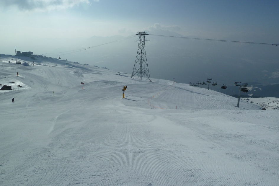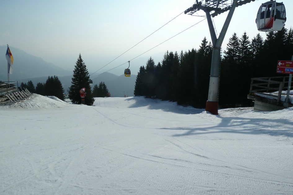 Start der blauen Abfahrten 49 (nach links zum Crap Sogn Gion), 51 (schräg links zu den Skiliften Ils Plauns) und 50 (gerade runter rechts an der Stütze der Pendelbahn Crap Masegn vorbei). Verzweigung der Abfahrten beim Schild. Rechts die Sesselbahn Alp Dado.