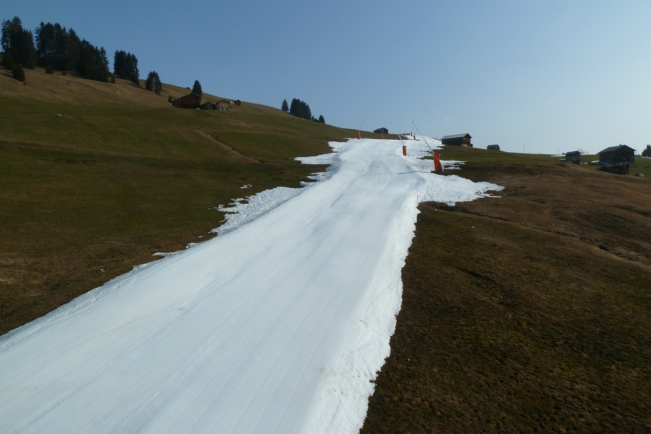 Blaue Abfahrt 53 (Falera) mit Sesselbahn Falera. Südhang, neben der Piste lag hier kein Schnee mehr.