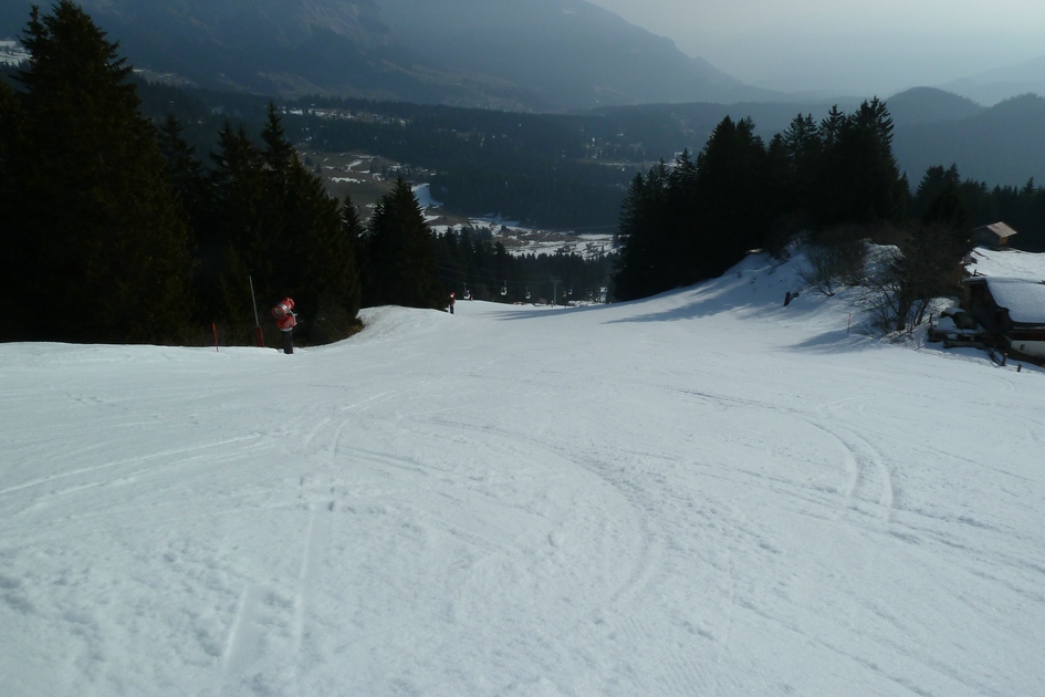 Letzter Steilhang der roten Abfahrt 45 mit Blick zur Talstaion Treis Palas.