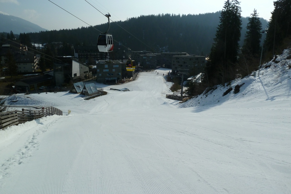 Blaue Abfahrt 52/rote Abfahrt 55 mit Blick zur Talstation Alp Dado.