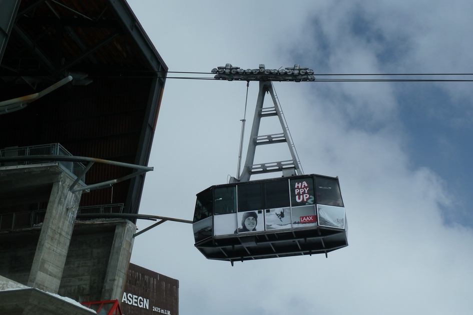 Rote Talabfahrt 64 nach Laax mit 12-EUB Larnags und Talstation der 120-PB Crap Sogn Gion. Wo früher der Parkplatz war ist jetzt das rocksresort.