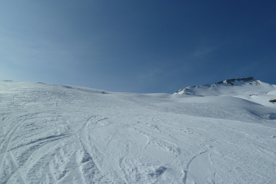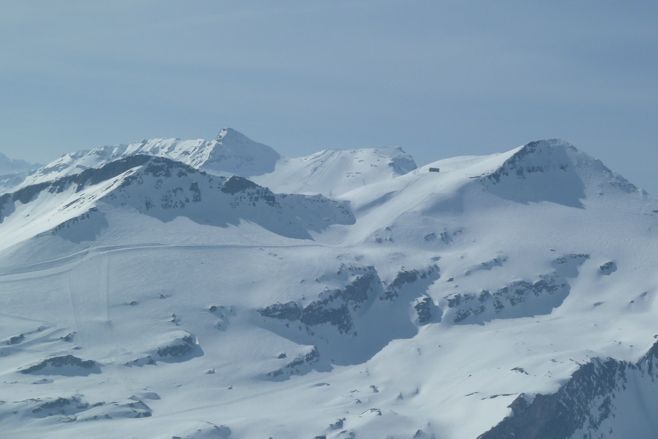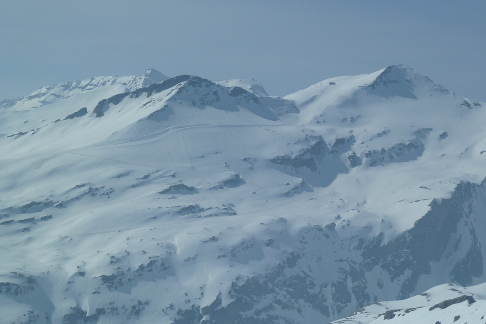 Zoom La Siala mit Bergstation der 3-KSB La Siala und der roten Abfahrt 10 (Siala Ost). Weiter im Hintegrund sieht man auch den Vorab Gletscher mit der roten Abfahrt 32 und 33.