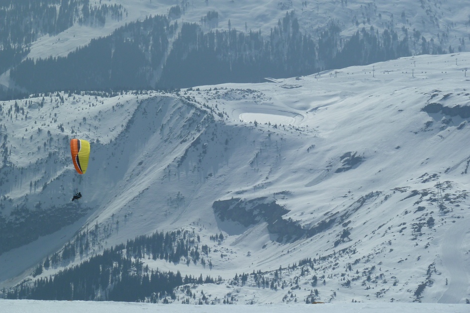 Blick zum Speicherteich Nagens und Scansinas mit Gleitschirmflieger