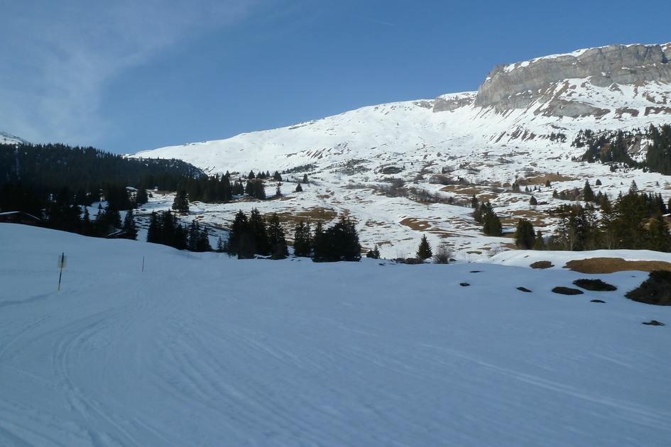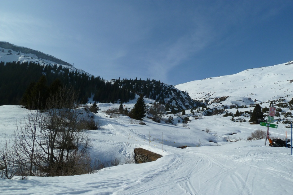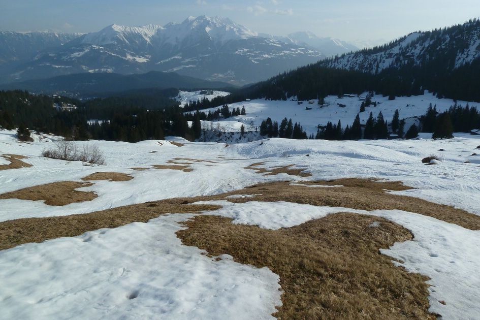 Rückblick von der blauen Abfahrt 10 (Tarschlims) zur roten Abfahrt 8 (nur schwach in der Bildmitte hinter/oberhalb der Bäume zu erkennen)